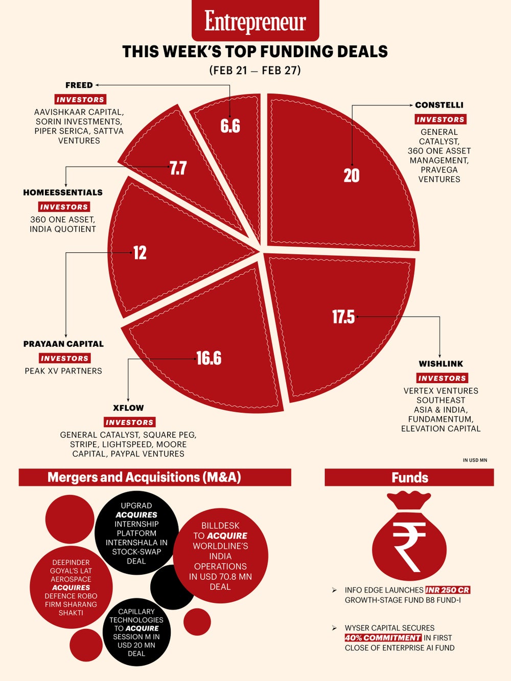 upGrad acquired internship platform Internshala in a stock-swap transaction to strengthen career services. BillDesk agreed to acquire Worldline’s India operations for USD 70.8 million, expanding its digital payments footprint. Capillary Technologies will acquire SessionM for USD 20 million to enhance loyalty solutions. Meanwhile, LAT Aerospace, backed by Deepinder Goyal, acquired defence robotics firm Sharang Shakti.