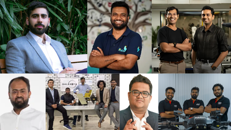 [L-R-T-B] Founders of Boldfit, Hala Mobility, CynLr, The Hosteller, GalaxEye, Easy Home Finance, & Marut Drones
